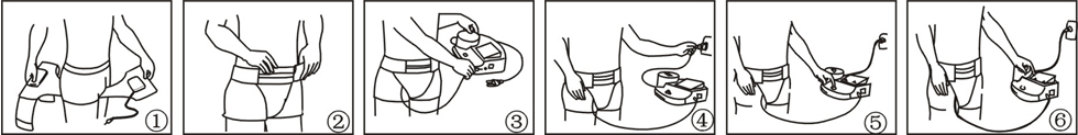 (1)准备治疗;(2)粘紧腰带;(3)将电内裤插头插入主机输出孔;(4)将电源插头插入网电源 ;(5)按下电源开关,拨动定时开关,定好时间,再拨动强中弱开关,先在强档治疗,根据自身热感,依次调节中弱档 ;(6)治疗完毕,关闭电源,再断开网电源。